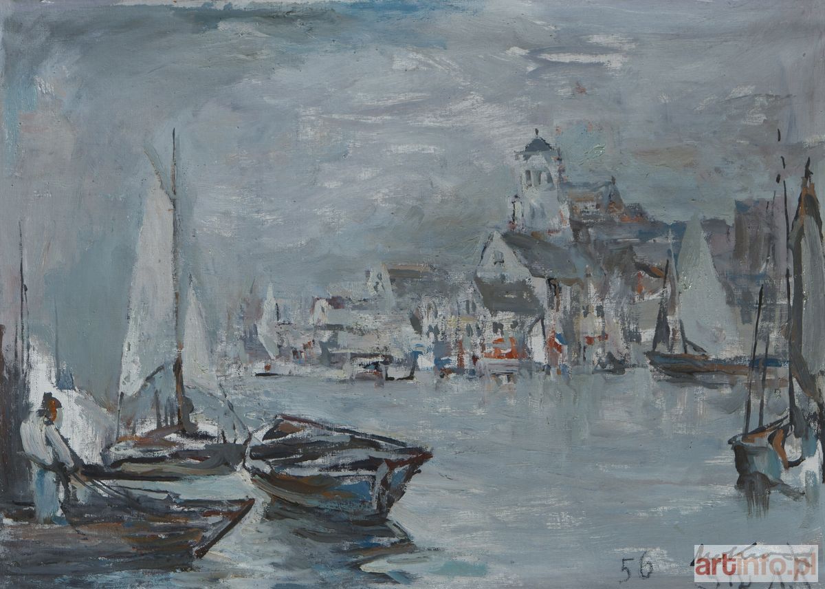 Olej, płótno; 50 x 70 cm Sygnowany l.d.: Mokwa Na ramie nalepka wystawowa z napisem drukowanym: Port rybacki - Władysławowo Obraz nabyty ok. 1985 r. od autora.
