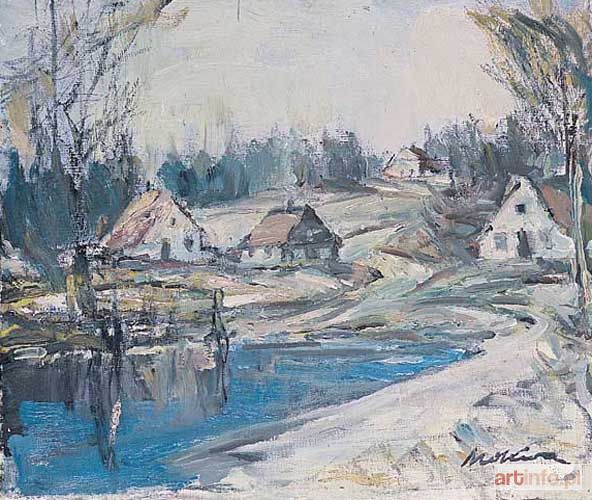 olej na płótnie, 50 x 59,5 cm sygnowany p. d. "Mokwa" Swobodnie, szeroko malowany pejzaż wiejski ze strumieniem. Utrzymany w sugestywnej, chłodnej i "wilgotnej" tonacji.