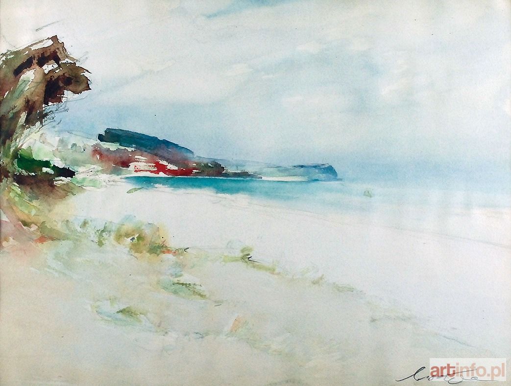 akwarela na podrysowaniu ołówkiem, papier; 43,5 x 54,5 cm (w świetle oprawy); sygn. p. d. ołówkiem: Mokwa; na odwrocie nalepka autorska? z napisem: 10)/ W zatoce/ Gdańskiej