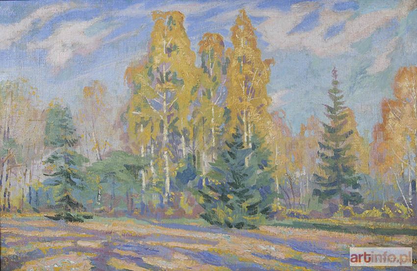 Obraz nasączony został przez artystę światłem, które sprawia wrażenie ostrego już powietrza. Jesienne złote liście brzóz zestawione zostały kontrastowo z ciemną zielenią świerków i jasnym błękitem nieba, które podkreśla ich delikatność i wiotkość. Malarz w tym późnym okresie swej twórczości odszedł już od bardziej precyzyjnego przedstawiania przyrody na rzecz ujmowania jej wrażeniowości, ulotności światła za pomocą zdecydowanych pociągnięć grubego pędzla.