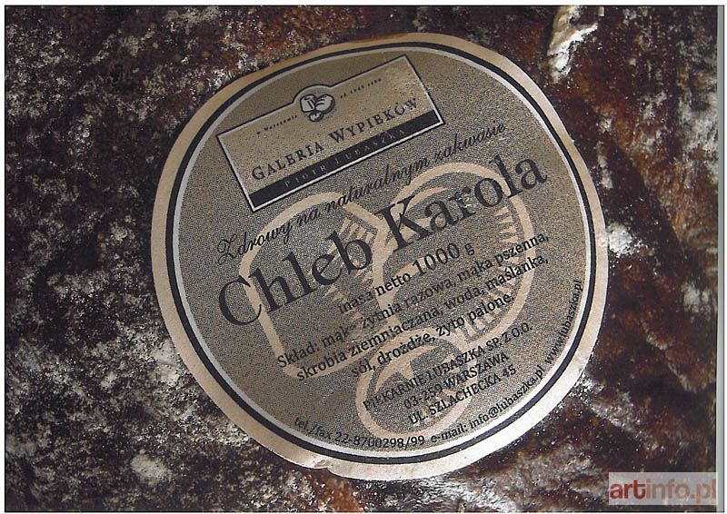 Praca przedstawia naklejkę na chleb opisującą skład produktu. W 1996 roku po rozmowie z Andrzejem Partumem czekałam na odpowiedni wypiek z ciekawą zawartością. Z tego cyklu powstało parę prac zwracających uwagę na ciekawy skład produktu. Mariola Przyjemska