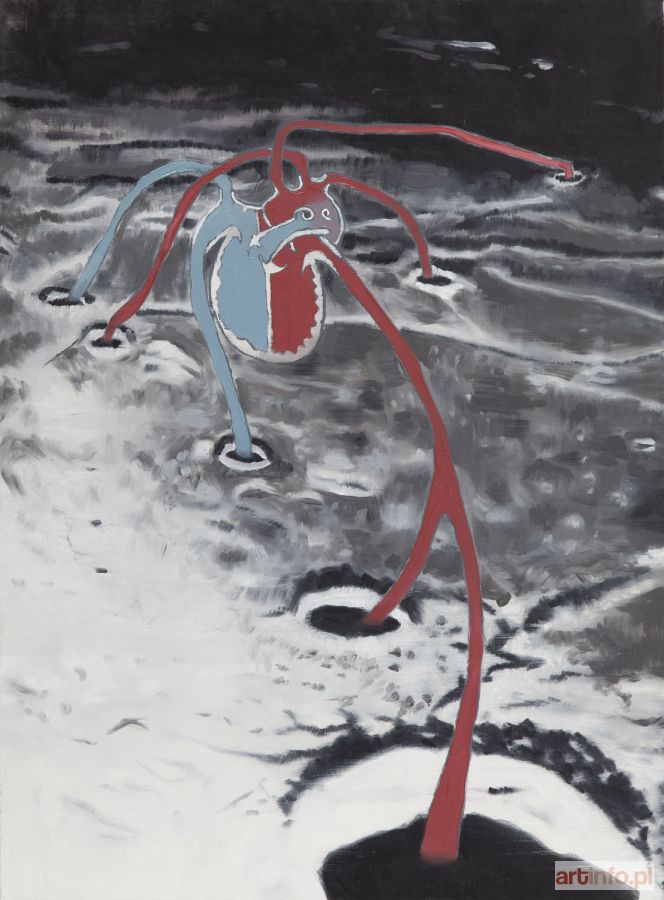 olej/płótno, 81 x 60 cm sygnowany, datowany i opisany na odwrociu: 'MICHAŁ FRYDRYCH | 189. 2008. 81x60 CM | "KSIĘŻYCOWE SERCE" | TAGI: ANATOMIA, SERCE, UKŁADKRWIONOŚNY, | ISKRY, SCIENCE-FICTION, KSIĘŻYC, | KRATERY, KOSMOS'