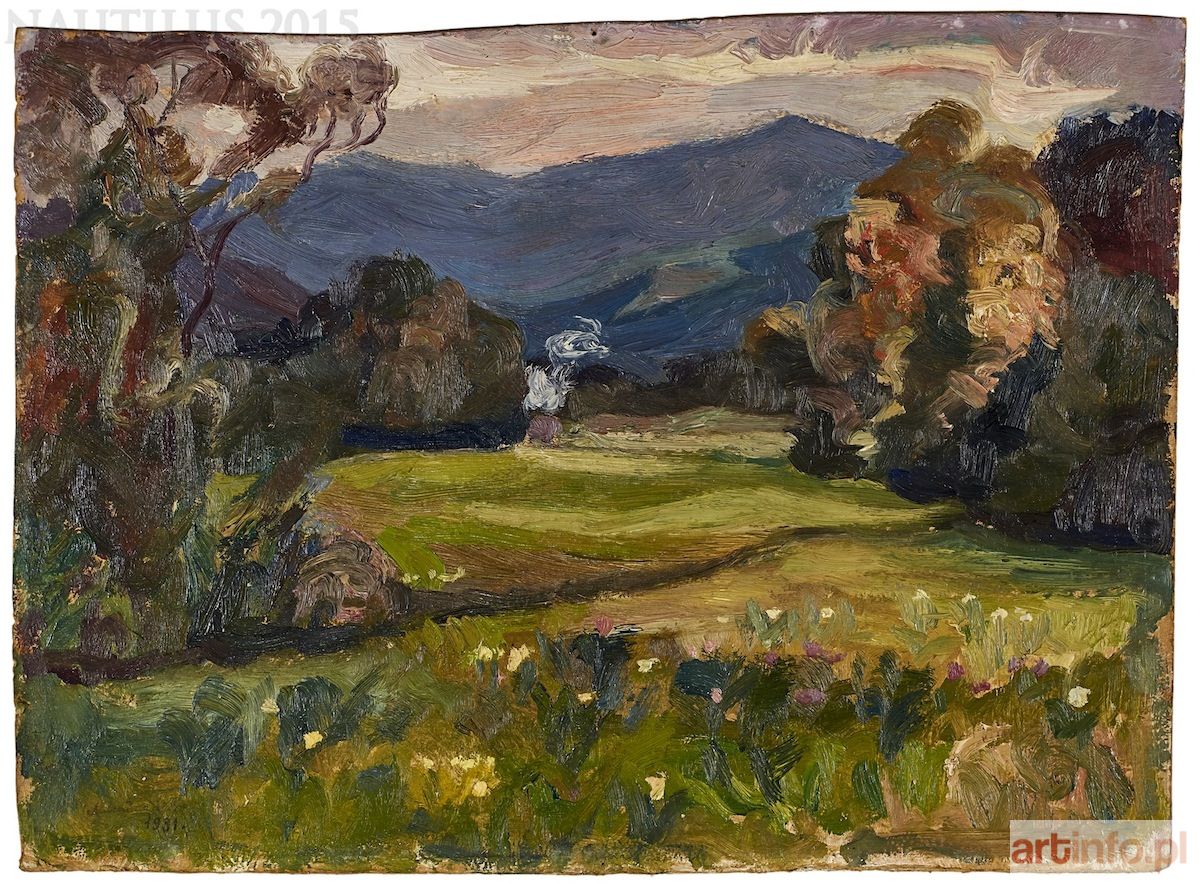 Olej, płótno; wym.: 37 x 51 cm; sygn. l.d. cyrylicą: Moroz 1931. Dodatkowo tytułowany cyrylicą na odwrocie, i ponownie sygnowany: Kosmacz, 1931 / Mychajło Moroz.