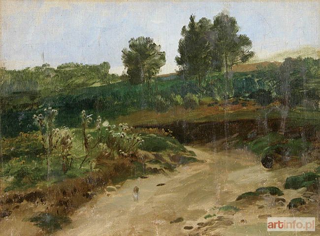 Letni krajobraz przedstawiający fragment polnej drogi, przy której rozciąga się porośnięta ostami łąka; w oddali drzewa; prześwietlony słońcem pejzaż charakterystyczny dla polskiego malarstwa pejzażowego początku XX wieku.