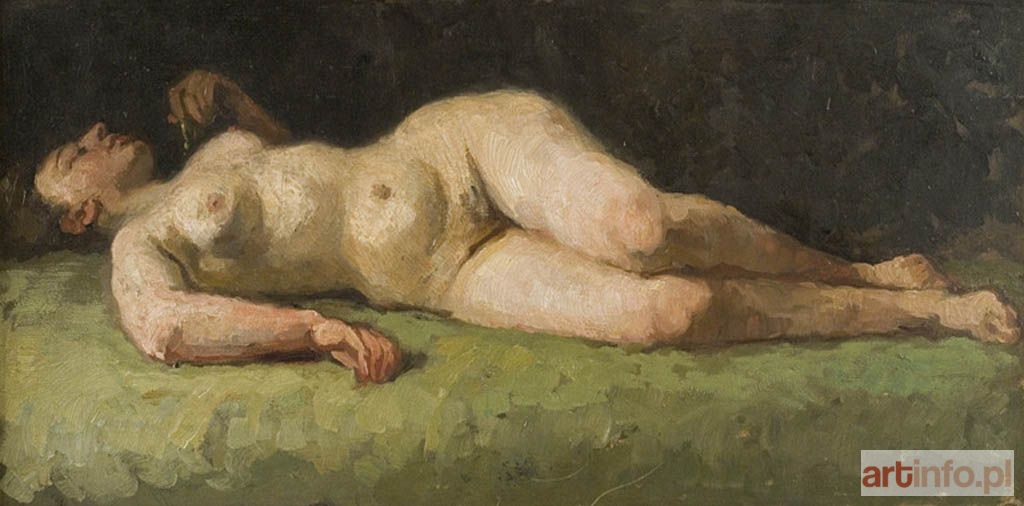 Akt kobiety leżącej w swobodnej pozie na zielonej tkaninie. Posługując się techniką impresjonistyczną artysta doskonale oddał karnację ciała modelki. Efekty kolorystyczne wzmocnione są ciemną tonacją tła oraz głęboką zielenią tkaniny.