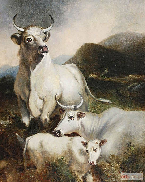Malarz nieokreślony, XIX w. | Byk, krowa i cielę na tle pejzażu