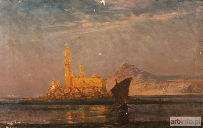 Pejzaż marynistyczny, utrzymany w konwencji romantycznej, przedstawiający zatokę z meczetem oraz łodzią żaglową na pierwszym planie. Centralnym punktem kompozycji jest błyszcząca w blasku zachodzącego słońca złota bryła budowli. Luministyczne efekty w partiach wody, nieba oraz jasno podświetlonego brzegu, stanowią o wartości artystycznej obrazu.