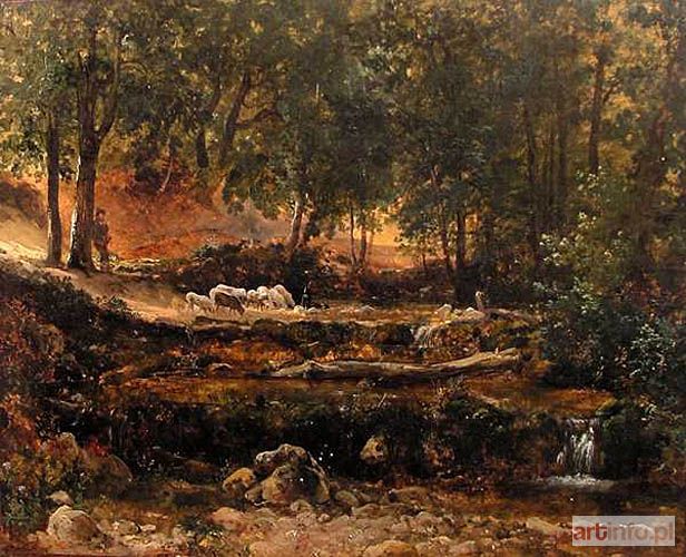 Malarz nieokreślony, XIX w. | Pejzaż leśny z owcami i pasterzem