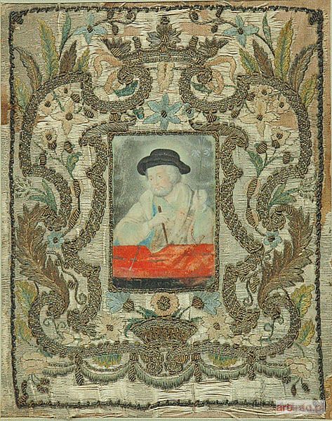 gwasz, skóra (?), całość umieszczona na haftowanej tkaninie, 7,5 x 5 cm (wymiar miniatury), 20 x 15,5 cm (wymiar całości w świetle oprawy); u dołu napis: S JOSEPH (?)