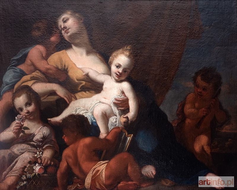 Prezentowany obraz, to bardzo interesujący i wyjątkowy przykład przedstawienia w jednym alegorycznym ujęciu miłosierdzia (Caritas) wraz z pięcioma zmysłami. Alegoria Caritas, miłości wspomagającej, altruistycznej, ofiarującej pomoc, najczęściej była wyobrażana jako postać młodej niewiasty, zajmującej się przynajmniej trójką dzieci i karmiącej jedno z nich swoją piersią. Tak też wygląda scena na prezentowanym obrazie - kobieta otoczona grupką brzdąców, z jednym z nich przy piersi. W tej pracy, małe dzieci są jeszcze jedną alegorią - przedstawieniem pięciu zmysłów. Maluszek siedzący na kolanach kobiety przy jej piersi i trzymający w ręku owoc symbolizuje zmysł smaku, zmysł dotyku jest reprezentowany przez chłopczyka uchwyconego ramienia kobiety i ją całującego, dziewczynka z kwiatkiem przy nosie reprezentuje zmysł węchu, do wzroku możemy przyporządkować chłopca z lustrem w ręku i patrzącego na dziewczynkę z kwiatem, a do słuchu chłopca w głębi trzymającego w rękach instrument muzyczny. Stylistyka dzieła "wydaje się być bliska szkole francuskiej z początku XVIII w. Tematyka alegorii Caritas czy pięciu zmysłów pojawia się w malarstwie, w odrębnych realizacjach, w zasadzie aż po wiek XVIII w rozmaitych kręgach artystycznych, zarówno na północy czy południu Europy. (...) Jednak taki typ kompozycji, ukazującej Caritas z alegorią pięciu zmysłów, spotykamy w malarstwie stosunkowo rzadko." (z opinii Piotra Michałowskiego, historyka sztuki, rzeczoznawcy z zakresu malarstwa).