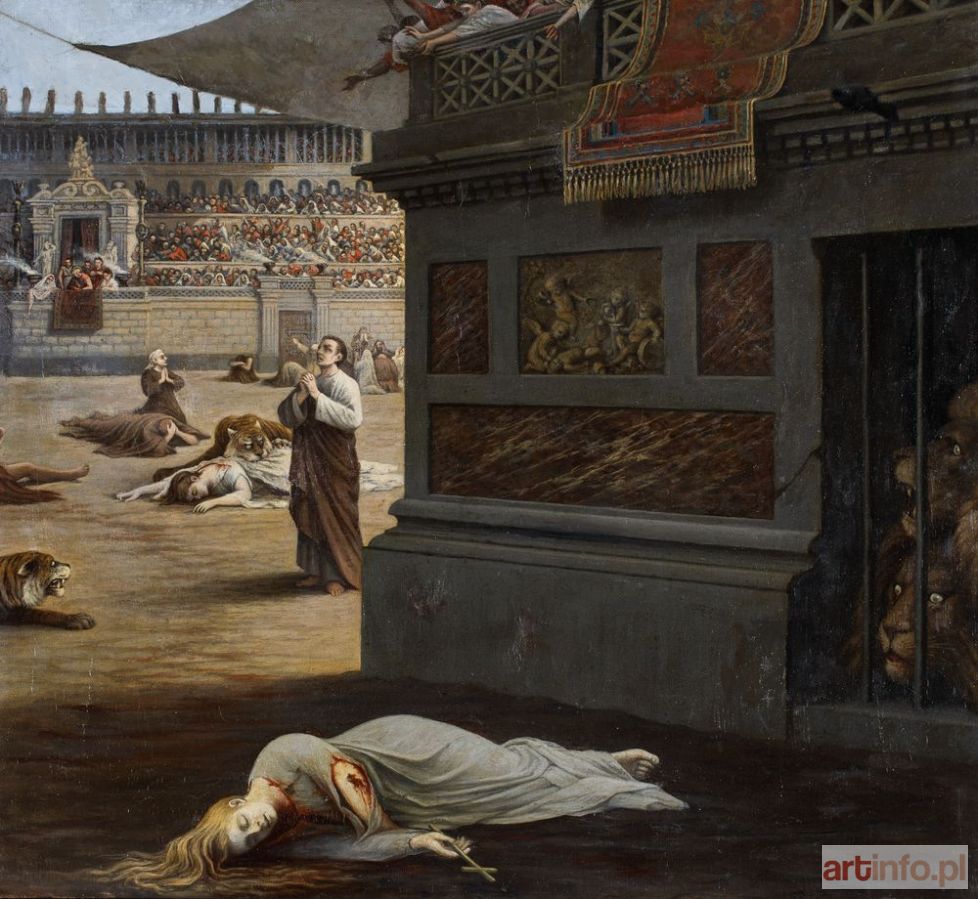 Obraz przedstawia igrzyska w Rzymie w czasach Nerona (pokazanego w loży cesarskiej), kiedy to obwinionych za podpalenie Rzymu chrześcijan miano wystawić na igrzyskach na pożarcie dzikim zwierzętom. Temat spopularyzowali Henryk Siemiradzki w malarstwie i Henryk Sienkiewicz w literaturze.
