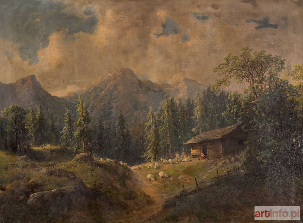 MALARZ nierozpoznany | PEJZAŻ ALPEJSKI Z PARĄ PASTERZY, 2 poł. XIX w.