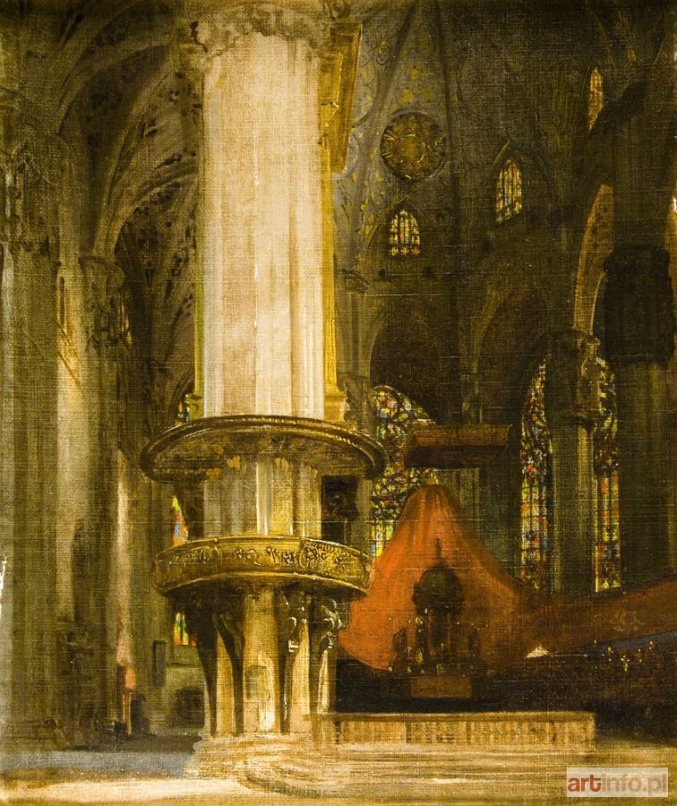 Na obrazie ukazane zostało wnętrze katedry mediolańskiej. Na pierwszym planie fragment nawy bocznej, filar z jedną z dwóch manierystycznych ambon, podtrzymywanych przez atlanty oraz prezbiterium z widocznym renesansowym ołtarzem z tempiettem, nad którym umocowano baldachim.
