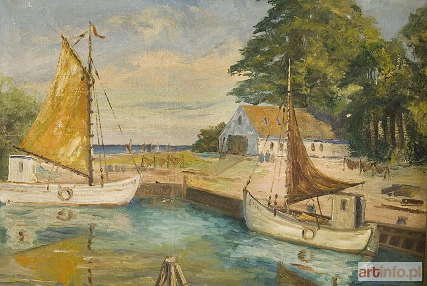 Z dużym wyczuciem barwy i światła, korzystając z doświadczeń impresjonizmu, przedstawił artysta w ujęciu kadru fotograficznego niewielką przystań żeglarską. Dwie łodzie przycumowane do kei, z łopoczącymi, postawionymi żaglami, tworzą pogodny, letni widok z wakacji - kartkę pocztową, wysyłaną najbliższym. Atmosferę ciepła i dobrego nastroju potęguje dodatkowo światło słoneczne rozlane w odbiciach w tafli wody. Partia nieba, zróżnicowanego w barwie, zrównoważona została plamą gęstwiny zieleni po prawej stronie kompozycji.