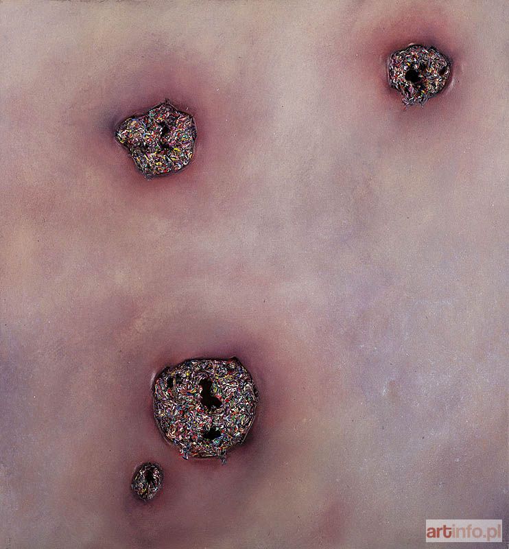 Technika własna, płótno; 54, 5 x 50,5 cm, sygn. na odwrocie: PAWEŁ MATYSZEWSKI/ KOMPLIKACJE 5/ 2010