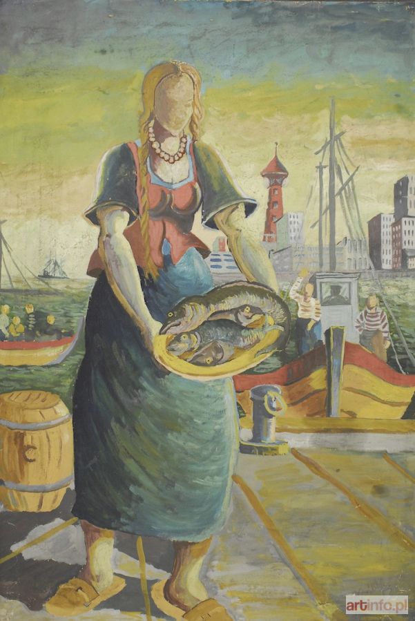 tempera, karton, 50 x 34,7 cm, sygn. p.d.: Wróbel. Na odwrocie autorska naklejka z tekstem pismem maszynowym: "Rybiarka" / Wróbel Paweł / Szopienice / ul. Obrońców Pokoju 33.