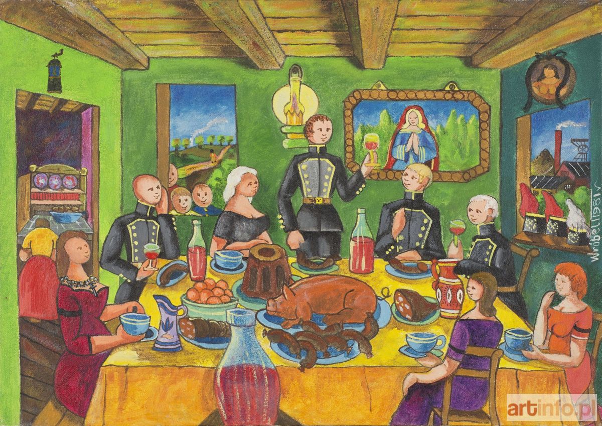 Akryl, płótno, 50,5 x 70,5, sygn. p.śr.: Wróbel 1981, na odwrocie opis autorski: "Górnik opłakuje...? Śmierć żony. Wystawna stypa świadczy, że smutek i żal po śmierci żony nie będzie trwał długo/ Wróbel Paweł 27 II 1981r."