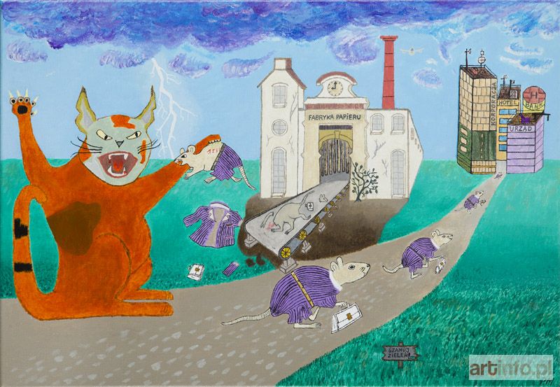 akryl/płótno, 38 x 55 cm sygnowany p.d.: 'P. M' na odwrociu opisany: 'Rozprawa z Biurokracją | 2015 Piotr Mazany'