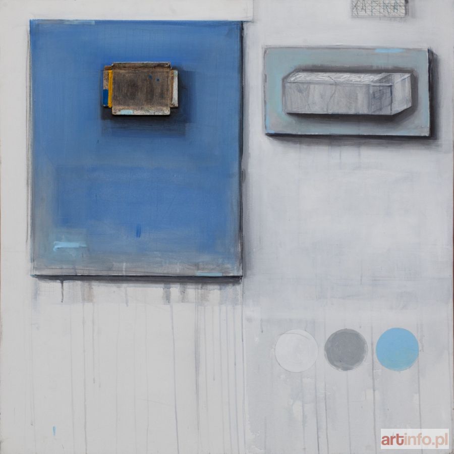 akryl, technika mieszana, płótno, 100 x 100 cm opisany na odwrocie: PIOTR WORONIEC JR. "TRAFO" / zs. MODELE ZASTĘPCZE 1981/2017 W NAWIĄZANIU DO AFORYZMU F. KAFKI NR. 55
