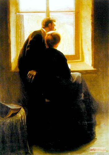 Kameralna, świetnie namalowana scena, świadczy o dobrym wykształceniu artysty, z pewnością absolwenta Akademii Petersburskiej. Pomimo statycznej kompozycji wyczuwalny jest nastrój nostalgicznego napięcia, z jakim zwrócona w stronę okna para wypatruje czegoś na zewnątrz. Niewyraźna, częściowo tylko widoczna sygnatura nie pozwala związać obrazu z konkretnym malarzem.