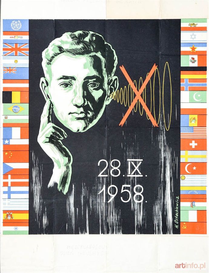1) Międzynarodowy Dzień Głuchoniemych, 28 IX 1958 - wydruk próbny, w dole, na złożeniu, niewielkie rozdarcie; 2) Światowa Federacja Głuchych / Międzynarodowy Dzień Głuchoniemych - wersja ostateczna, odręcznie poprawiona data (28 IX 1958 zmieniono na 27 IX 1959), druk Dorgan, w dole, przy prawej krawędzi niewielkie zaplamienie, powstałe w czasie odbijania grafiki; plakat otrzymał I nagrodę w Międzynarodowym Konkursie na Plakat Światowej Federacji Głuchych, Bruksela 1958; sitodruk kolor., oba plakaty w st. bdb., ze śladami złożeń, nieznaczne naddarcia na złożeniach, na verso doklejone współczesne, krótkie noty biograficzne autora; wymiary arkuszy: 503x704 mm;