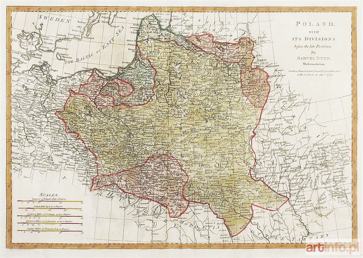 w prawym, górnym narożu kartusz z napisem: "POLAND / WITH / ITS DIVISIONS / before the late Partition. / By / SAMUEL DUNN, Mathematician / London, Printed for Rob[er]t Sayer, No 53 in Fleet Street, / as the Act directs 10 Jan[uar]y 1774.";