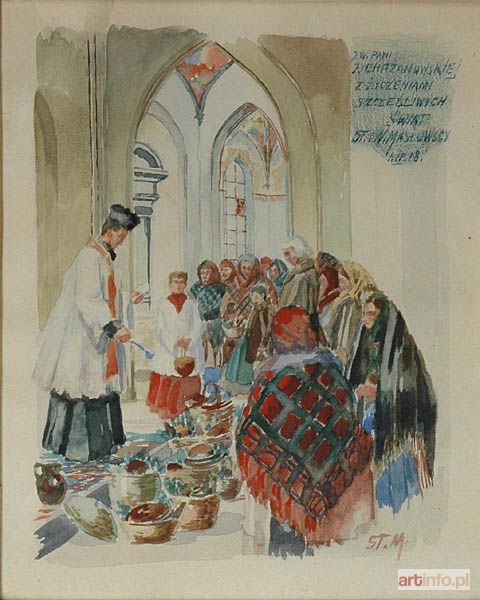 akwarela, papier, 25 x 20,5 cm; sygn. p.d.: ST.M.; dedykacja p.g.: J. W. PANI / W. CHRZANOWSKIEJ / Z ŻCZENIAMI / SZCZĘŚLIWYCH / ŚWIĄT / ST i W. MASŁOWSCY / 1.IV.18.