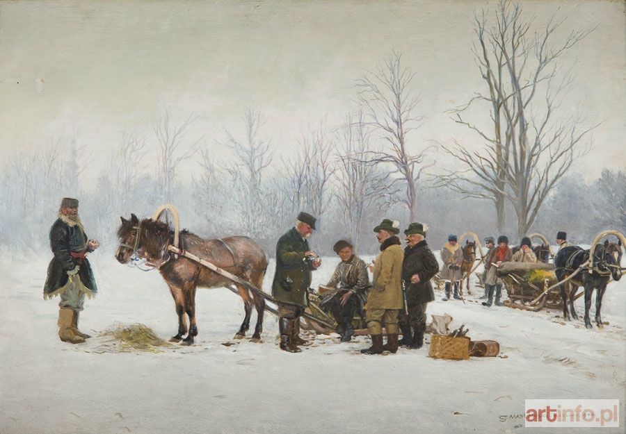 Stanisław Masłowski był wielostronnym artystą, kojarzonym z doprowadzeniem do maestrii trudnej techniki akwareli. Jeśli spojrzeć na prezentowany obraz, staje się jasnym, że talent malarza rozwinął się również w dziedzinie techniki olejnej. Ten nieduży obraz, pochodzący z najlepszego okresu artysty, przedstawia prostą scenkę. W przeważającej części polskiego malarstwa obierającego za temat polowanie istotną rolę odgrywa gwałtowny ruch, niepokój (rozdęte końskie chrapy) i specyficzny typ anegdoty. U Masłowskiego wilki nie atakują koni, a te nie muszą pokonywać ostrego zakrętu. I nie są smagane batem. Panuje tu atmosfera mogąca się kojarzyć z rodzajowym malarstwem holenderskim złotego wieku. Mężczyźni zatrzymali się na chwilę bądź zaraz rozpoczną polowanie. Pokrzepiają się napojem - można przypuszczać, że jest to wódka bądź inny alkohol pity "dla kurażu". Koń, wspólnik człowieka, również zasługuje na pokrzepienie się. Całość tej prostej i ujmującej sceny spowita jest delikatną, biało-błękitną mgiełką.
