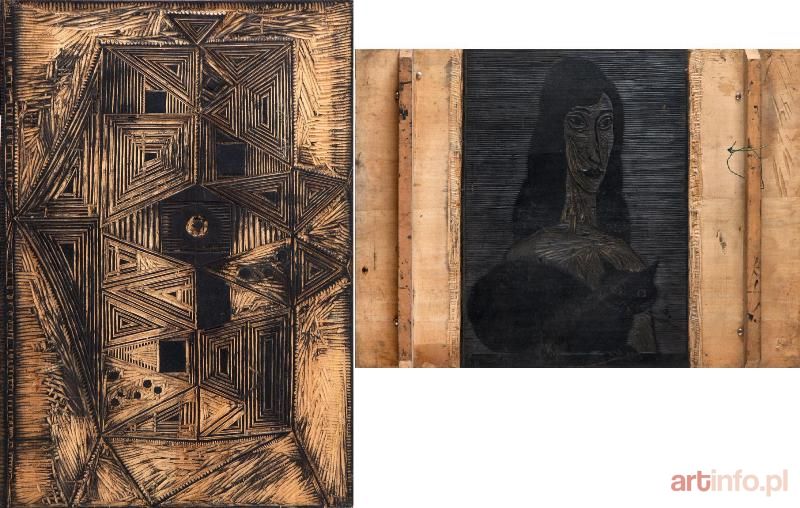 klocek drzeworytniczy dwustronny, 50 x 71 cm ODWROCIE: matryca z przedstawieniem Kobiety z kotem (50 x 35,5 cm)