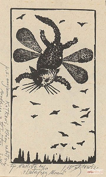 drzeworyt; wym.: 125 x 70 mm; sygn. oł. p.d., odb. autorska nr 20/100; wzdłuż lewej: Mojemu kotkowi, który zabił się spadając z V piętra.