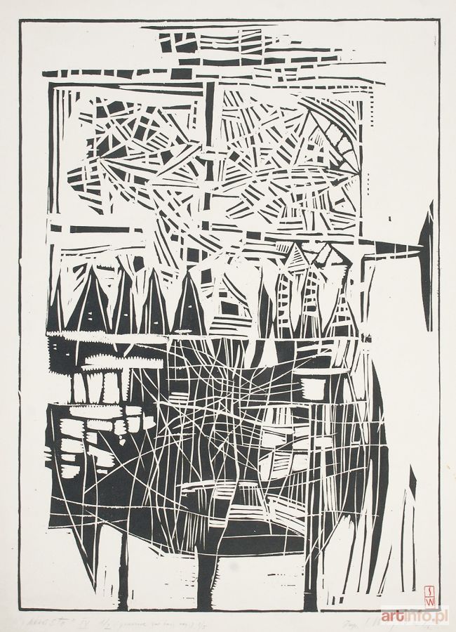 drzeworyt, papier; 74 x 53 cm (wymiar arkusza w świetle passe-partout), 71 x 50 cm (wymiar odbitki); sygn. p. d.: S/W (stemplem autorskim), oraz poniżej: Imp. S. Wójtowicz 61. (ołówkiem); tytuł l. d.: „Miasto” IV 1/2 (gravure sur bois org.) 1/5 (ołówkiem).