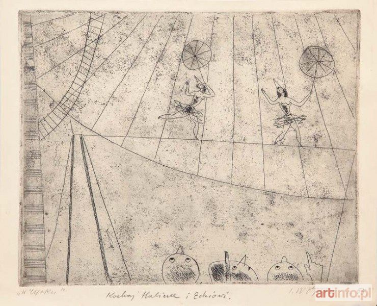 sucha igła/papier, 18,5 x 23 cm (odcisk płyty) sygn. i dat. p.d.: `S. Wójtowicz 55`, w l.d. tytuł: ` "W cyrku" `; u dołu dedykacja: `Kochanej Halinie i Edziowi`
