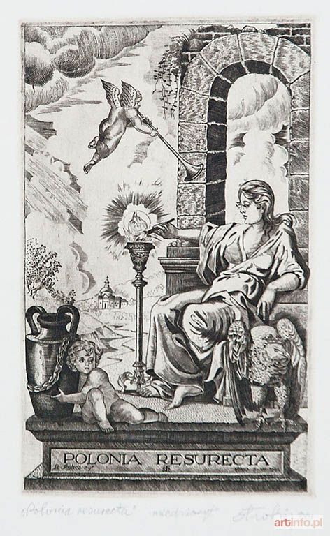 miedzioryt, 19 x 11,8 cm (odcisk płyty); sygn. na płycie: l. d.: St. Rolicz ryt.; p. d.: Wilno 9 - VIII - 1944; opisana przez autora u dołu: "Polonia resurecta" miedzioryt StRolicz 944 (ołówkiem)