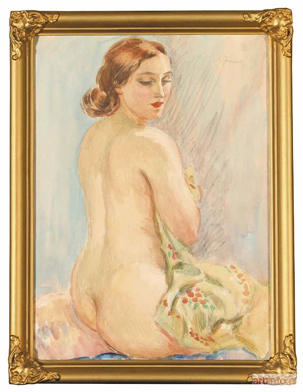 akwarela, kredka/papier, 51 x 38 cm sygnowany p. g.: `St. Żurawski` na odwrocie odręczny napis: `St. Żurawski | akt - siedzący | akw.`