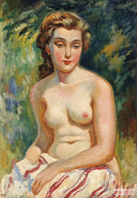 Stanisław Żurawski uczył się w latach 1907-13 w krakowskiej Akademii Sztuk Pięknych u Józefa Mehoffera i Wojciecha Weissa. W trakcie studiów wielokrotnie otrzymywał nagrody i medale za swoje prace szkolne. Był członkiem i współzałożycielem Cechu Artystów Plastyków Jednoróg, z którym w latach 1925-32 stale wystawiał swoje obrazy. Malował portrety, kompozycje figuralne, martwe natury i pejzaże. Najczęściej jednak tworzył akty i półakty kobiece przedstawiane bądź to w plenerze, bądź na tle barwnych, dekoracyjnych tkanin, makat, pościeli i poduszek. W obrazach tych widać wyraźne inspiracje sztuką nauczyciela akademickiego artysty - Wojciecha Weissa. Prezentowany obraz to spotykane w twórczości Żurawskiego ujęcie postaci półnagiej kobiety na tle przyrody. Obraz odznacza się charakterystyczną dla prac tego artysty żywą kolorystyką i swobodnym modelunkiem.