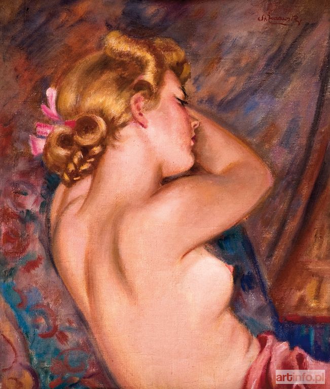Stanisław Żurawski uczył się w latach 1907-13 w krakowskiej Akademii Sztuk Pięknych u Józefa Mehoffera i Wojciecha Weissa. W trakcie studiów wielokrotnie otrzymywał nagrody i medale za swoje prace szkolne. Był członkiem i współzałożycielem Cechu Artystów Plastyków Jednoróg, z którym w latach 1925-32 stale wystawiał swoje obrazy. Malował portrety, kompozycje figuralne, martwe natury i pejzaże. Najczęściej jednak tworzył akty i półakty kobiece przedstawiane bąd¼ to w plenerze, bąd¼ na tle barwnych, dekoracyjnych tkanin, makat, pościeli i poduszek. W obrazach tych widać wyra¼ne inspiracje sztuką nauczyciela akademickiego artysty - Wojciecha Weissa. Prezentowany obraz to spotykane w twórczości Żurawskiego ujęcie postaci półnagiej kobiety. Obraz odznacza się charakterystyczną dla prac tego artysty żywą kolorystyką i swobodnym modelunkiem.