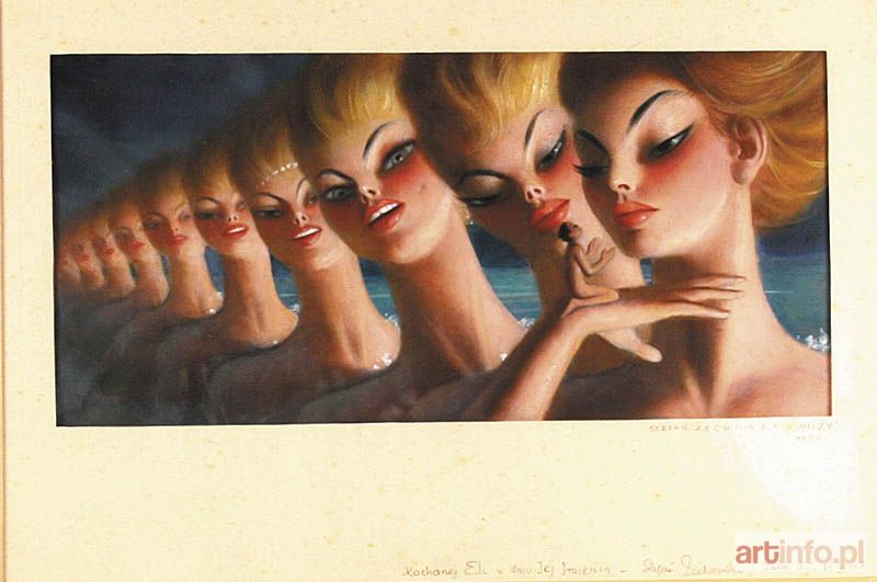 pastel/papier, 18,5 x 38,5 cm (w świetle passe - partout) sygnowany, datowany oraz tytuł autorski ołówkiem na passe - partout: `STEFAN ZECHOWSKI "MUZY" | 1967` oraz dedykacja: `Kochanej Eli w dniu Jej Imienin - Stefan Żechowski Zabrze 24.III.1967`