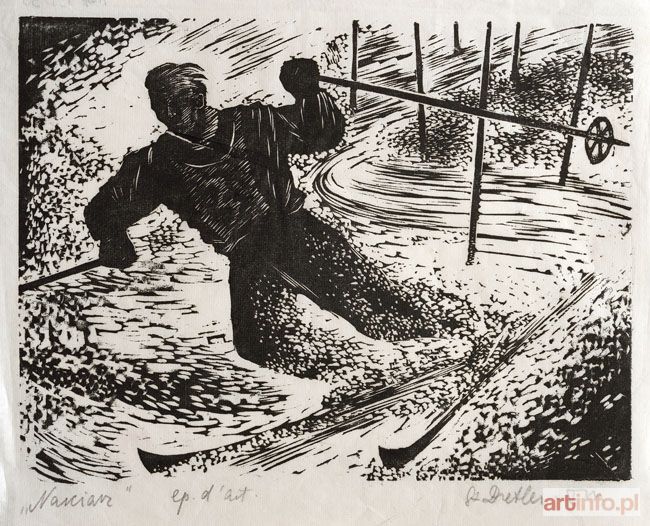 drzeworyt na papierze, 15 x 20 cm, sygnowany ołówkiem pod klockiem, p.d. "St. Dretler-Flin", l.d. "Narciarz".