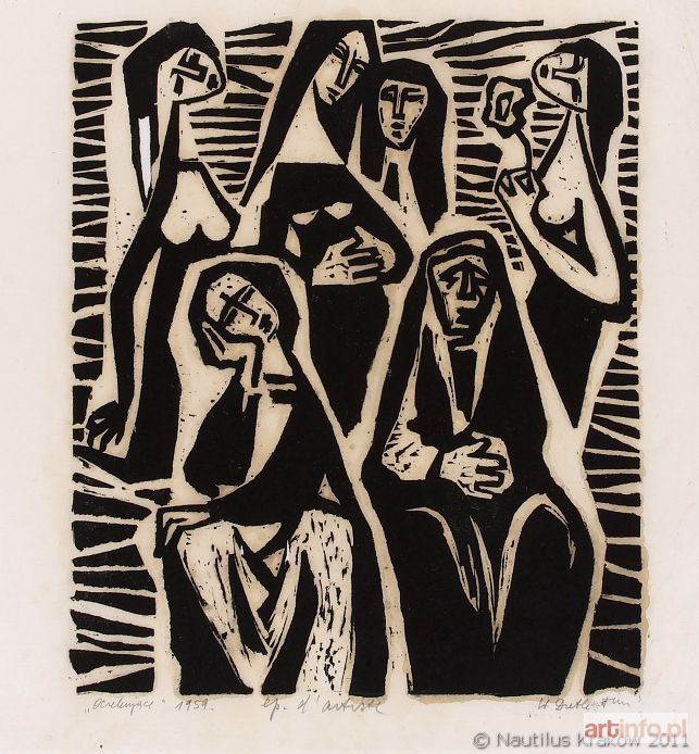 Drzeworyt ręcznie podkolorowany na bibule; wym.: 300 x 250 mm; sygn. oł. p.d.: St. Dretler-Flin, tyt. i dat. l.d.; stan zachow.: podłużny ubytek w lewej górnej części pracy.