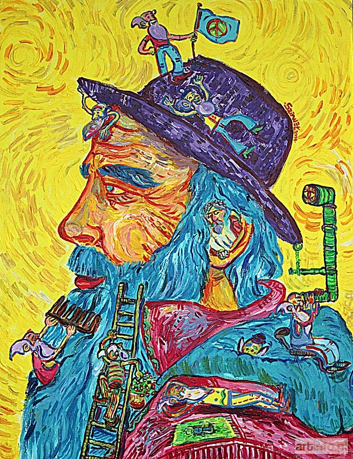 Szaweł Płóciennik (ur. 18.02.1987 w Warszawie) - twórca powieści graficznych, student warszawskiej ASP na wydziale malarstwa. W komiksie poszukuje relacji prawdziwych bohaterów. Stworzył album wspólnie z ojcem Jarosławem, o roku 1980 na warszawskiej Woli ("Sprane Dżinsy i Sztama"), narysował także komiks "Moja Terapia", będący pamiętnikiem Sławomira Gołaszewskiego (protoplasty polskiej muzyki reggae) z czasów jego pracy w psychiatryku. Najnowsze dzieło Płóciennika to autorski album "Pinki", opowiadający o losach Krzysztofa "Pinkiego" Brandta - ostatniego hipisa i pierwszego hipstera Warszawy. Komiks ukazał się w maju tego roku, nakładem wydawnictwa Kultura Gniewu. Obraz przedstawia "Pinkiego" w otoczeniu jego komiksowych wcieleń.