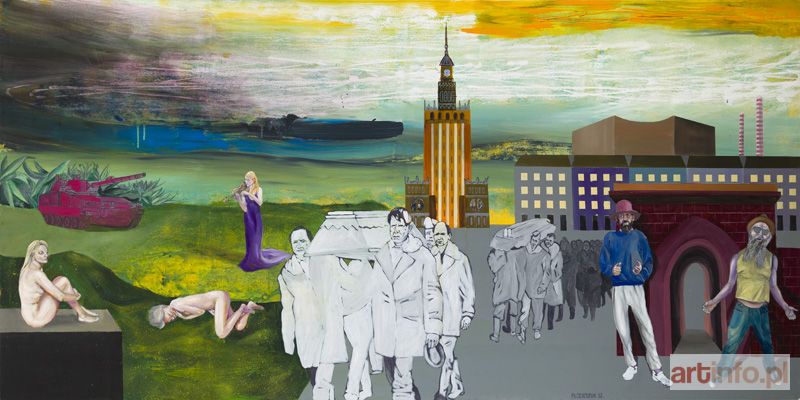technika mieszana, akryl, olej/płótno, 150 x 300 cm sygnowany p.d.: 'PŁÓCIENNIK SZ.' na odwrociu opisany: 'Szaweł Płóciennik - Tutaj na pewno umrzemy 2017'