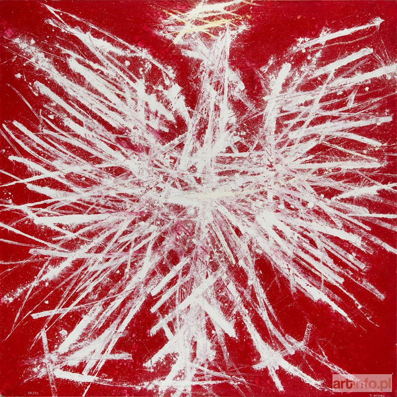 akryl/płótno, 145 x 145 cm sygnowany p.d.: `T. MUSIAŁ` oraz napis l.d.: `ORZEŁ` sygnowany, datowany i opisany na odwrociu: `ORZEŁ BIAŁY (WHIPPING) | TOMASZ MUSIAŁ 2005 | AKRYL` oraz nalepka wystawowa z Galerii Olimpus. Do pracy dołączona jest płyta DVD z zapisem powstawania obrazu w autorskiej technice biczowania płótna skórzanym rzemieniem. WYSTAWIANY: - "Orzeł Biały / Orzeł czerwony", wystawa indywidualna, Galeria Olimpus, Łódź, 4 grudnia 2014 - 15 stycznia 2015 - "Performance intymny", wystawa indywidualna, Centrum Promocji Młodych Willa Generała, Częstochowa, wrzesień 2012 - "Tożsamość", wystawa zbiorowa, BWA, Tarnów, 2011 - "Architektura PTCL", wystawa indywidualna, Galeria Konduktorownia, Częstochowa, 2010 - "Strong man & Strange man", wystawa indywidualna, Miejska Galeria Sztuki 13 muz, Szczecin, 23 października - 2 grudnia 2010 - "Polska - Poland", wystawa zbiorowa, Bałucki Ośrodek Kultury Rondo, Łódź, 2008 - "Na granicy akademii", wystawa zbiorowa, Galeria El, Elbląg, 2008 - "Triennale Sztuki Najnowszej", wystawa zbiorowa, Galeria Konduktorownia, Częstochowa, 2008 - "Malarstwo", wystawa indywidualna, BWA Sieradz, 2005 - "Oblicza Solidarnosci. Solid Art.", wystawa zbiorowa, - European Parliament, Altiero Spinelli Building; Université Libre de Bruxelles, Le Grand Hall, Bruksela (Belgia) Museu d`Història de Catalunya, Barcelona (Hiszpania) 2005 LITERATURA: - Orzeł Biały / Orzeł czerwony, katalog wystawy, Galeria Olimpus, Łódź 2014