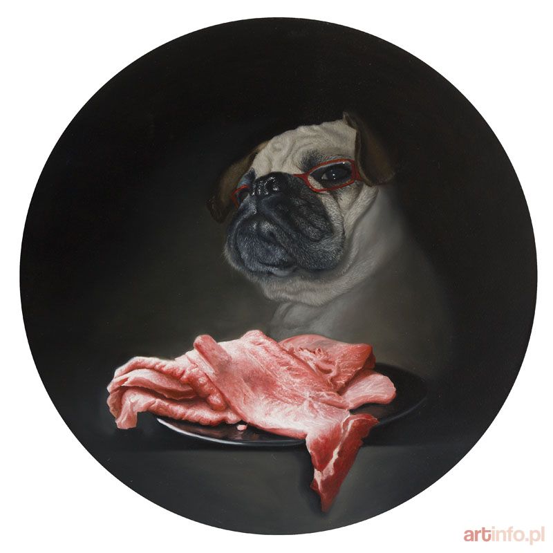 olej/płótno, 100 x 100 cm sygnowany, datowany i opisany na odwrociu: 'TOMASZ POZNYSZ | "DYSKURS NAD SZTUKĄ MIĘSA", 2015 | obraz dedykuję M.M'