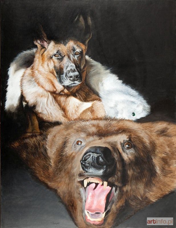 akryl/płótno, 130 x 100 cm sygnowany l.d.: `T. Poznysz` na odwrociu opisany: `Tomasz Poznysz | "Pies z lisem i niedźwiedziem" 2013`
