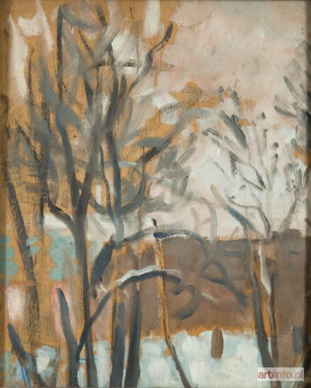 "Przychodzą lata wojny - czas zamętu i zagubienia. Nie jest to pora przyjazna takiemu malowaniu, jakie jest treścią życia Tymona Niesiołowskiego. Na to, by przeżywać świat w takim cichym, radosnym zapatrzeniu, trzeba trochę spokoju, trochę psychicznej przestrzeni. Tymczasem malowanie w wojennym Wilnie jest raczej borykaniem się - nie tylko z materią malarską - ale i z zagrożeniem, zimnem, i biedą. `Rozpocząłem nowy krajobraz - notuje Niesiołowski w styczniu 1944 roku. - Drzewa w rozmaitej tonacji na tle zimnego nieba. Stosuję manierę pionowych pociągnięć pędzla. Raczej - pionowo ukośnych, tak by się rytmicznie kolor wznosił i opadał, przy użyciu jednokierunkowych dotknięć. (...) Czasu mam dla siebie, mało`. `Znowu pada śnieg. (...) Na pustych ulicach - było jasno i bardzo miło. Coś nienormalnego odczuwałem w całej tej ciszy. Postanowiłem jutro choć jedną godzinę pomalować. Zobaczę, jak mi się to uda?` (10.1.44 r.) (...) `Mróz wzmaga się na noc. Dzień upłynął na rannym piłowaniu i rąbaniu drzewa. Bolała mnie ręka w przegubie. Trochę malowałem` (13.1.44 r.)". JOANNA POLLAKÓWNA, TYMON NIESIOŁOWSKI, KATALOG WYSTAWY, MNW, PAŹDZIERNIK-LISTOPAD 1982, WARSZAWA 1982, S. 10