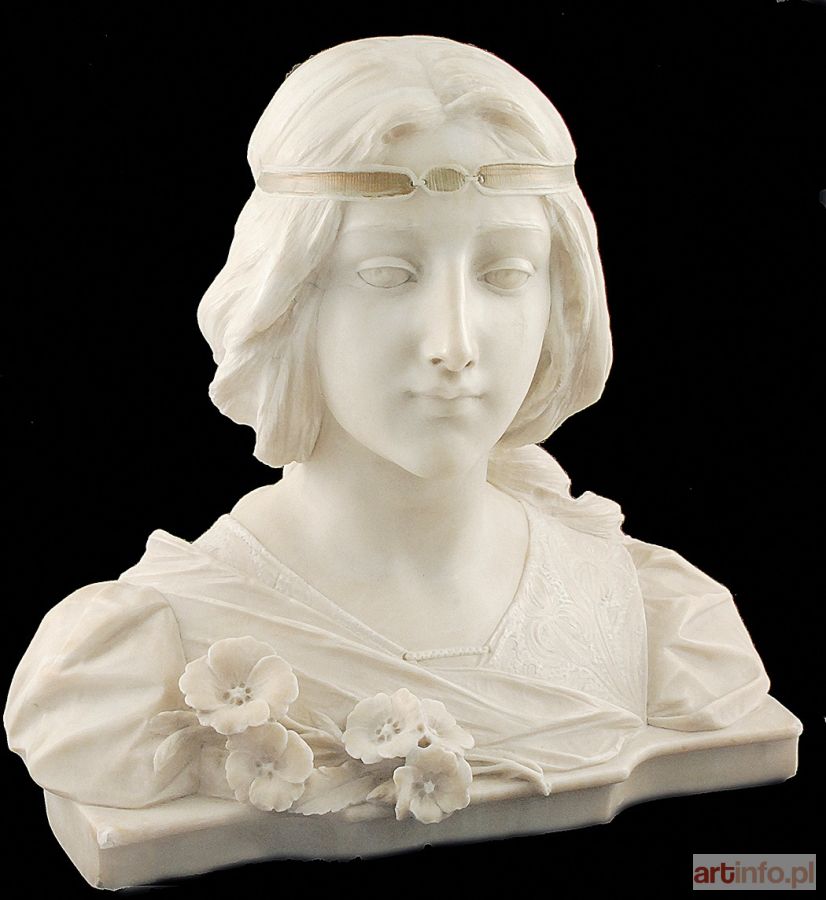popiersie młodej dziewczyny o luźno upiętych włosach, ozdobionych cienką opaską, w stroju historycznym ze świeżymi kwiatami przy dekolcie; alabaster; 40 x 40 x 18 cm; sygn. z boku: V Pochini Cléopatra Diana de Mérode (1875-1966), francuska tancerka baletowa okresu Belle Époque.