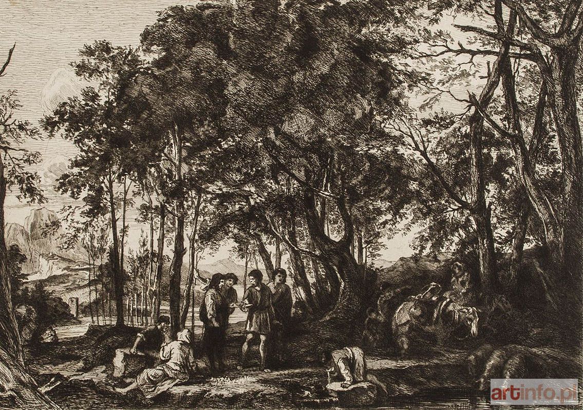 Akwaforta, papier; 275 x 377 mm (arkusz) 205 x 257 mm (odcisk płyty) Sygnowany z płyty l.d.: Salv. Rosa pinx.; p.d.: W.Woernle sculps.; niżej: DER HAIN DER PHILOSPOHEN. | GALERIE PITTI ZU FLORENZ. | Verlag von J. Engelhorn in Stuttgart.