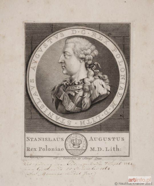 Miedzioryt; wym. komp.: 207 x 165 mm; sygn. pł. l.d.: C.F. Frtitsch delin et fecie; portret zwrócony w lewo, w otoku napis: Stanislaus Augustus D.G. Rex Poloniae M. D. Pod kompozycją powtórzony opis, rozdzielony rewersem wybitego w Londynie medalu koronacyjnego (z koroną oraz napisem: Hanc Iussit Fortuna Mereri oraz El Un Voce VIII Sept. Corona XXV Nov. / XDCCLXIV). Niżej nota typograficzna: Fe. Amsterdam by Samuel Cruys oraz opis kolekcjonerski w jęz. niem. Stan zachowania bardzo dobry, szerokie marginesy. Druk pamiątkowy z okazji elekcji i koronacji Stanisława Augusta. Lit.: E. Hütten-Czapski, "Spis rycin przedstawiających portrety przeważnie polskich osobistości?", reprint Warszawa 2001, poz. 1831. Rzadkie!