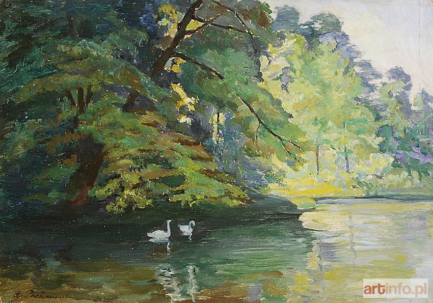 Studia artystyczne rozpoczął w Państwowej Szkole Sztuk Zdobniczych i Przemysłu Artystycznego w Poznaniu w latach 1920-25. Następnie kontynuował je w Akademii Sztuk Pięknych w Krakowie u Fryderyka Pautscha (1925-29). Twórczość Przebindowskiego obejmuje głównie malarstwo olejne i grafikę. Malował sceny rodzajowe, widoki podkrakowskich wsi, portrety, martwe natury, pejzaże miejskie i akty. Obraz utrzymany jest w kolorze nasyconej zieleni w różnych tonacjach. W podcieniu drzew na stawie unoszą się dwa łabędzie, których białe pióra mienią się jasnym odcieniem zielonkawych liści. Obraz malowany jest lekko i swobodnie, z wyczuciem światła.