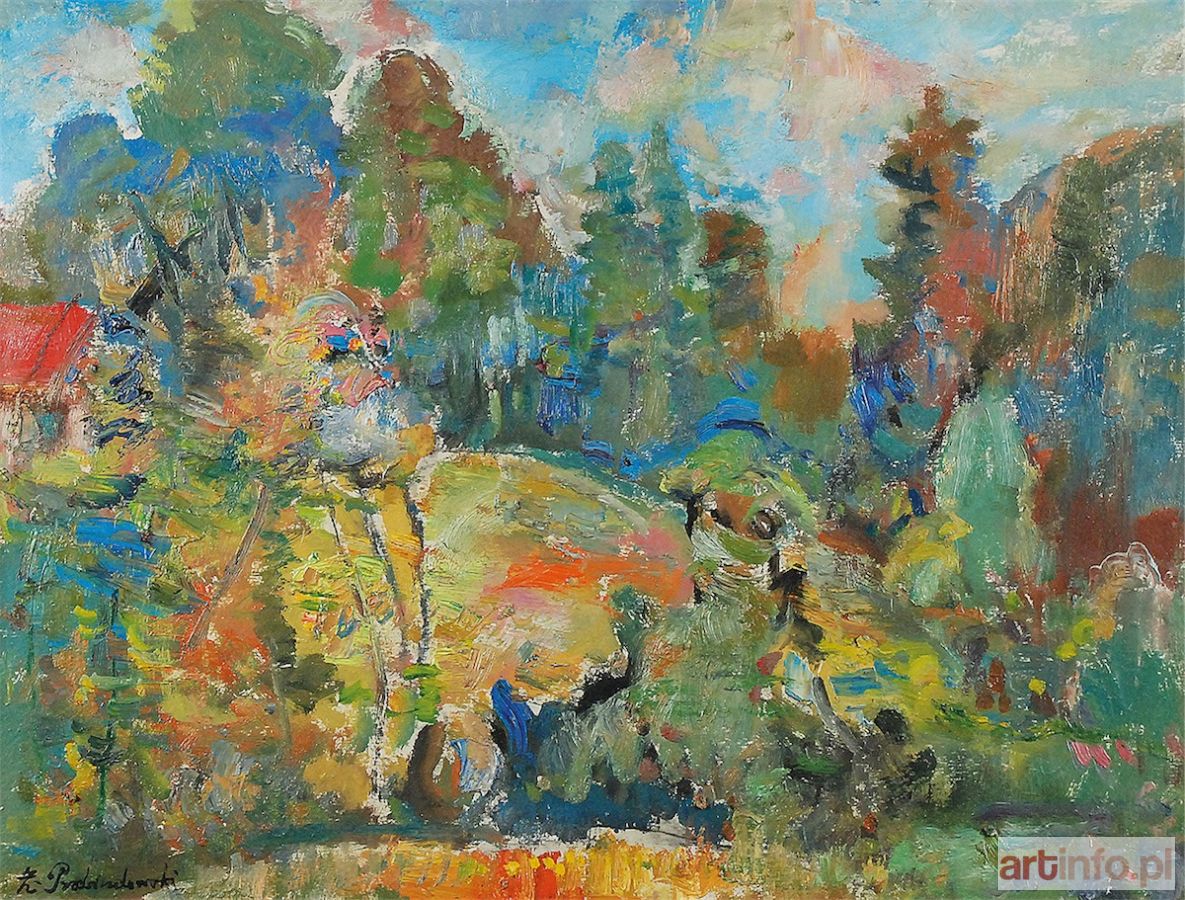 olej, tektura; 38 x 50 cm; sygn. l. d.: Z. Przebindowski na odwrocie dwie nalepki: z odręcznym, autorskim napisem - Zdzisław Przebindowski / " Pejzaż z Kalwarji" / olej 38 x 50; oraz drukowana z Cechu Rzemiosł Różnych w Kalwarii, Towarzystwo Przyjaciół w Kalwarii Z.[ebrzydowskiej] ,Miejski Ośrodek Kultury w Kalwarii, z tytułem: Pejzaż z Kalwarii i datą 1987.